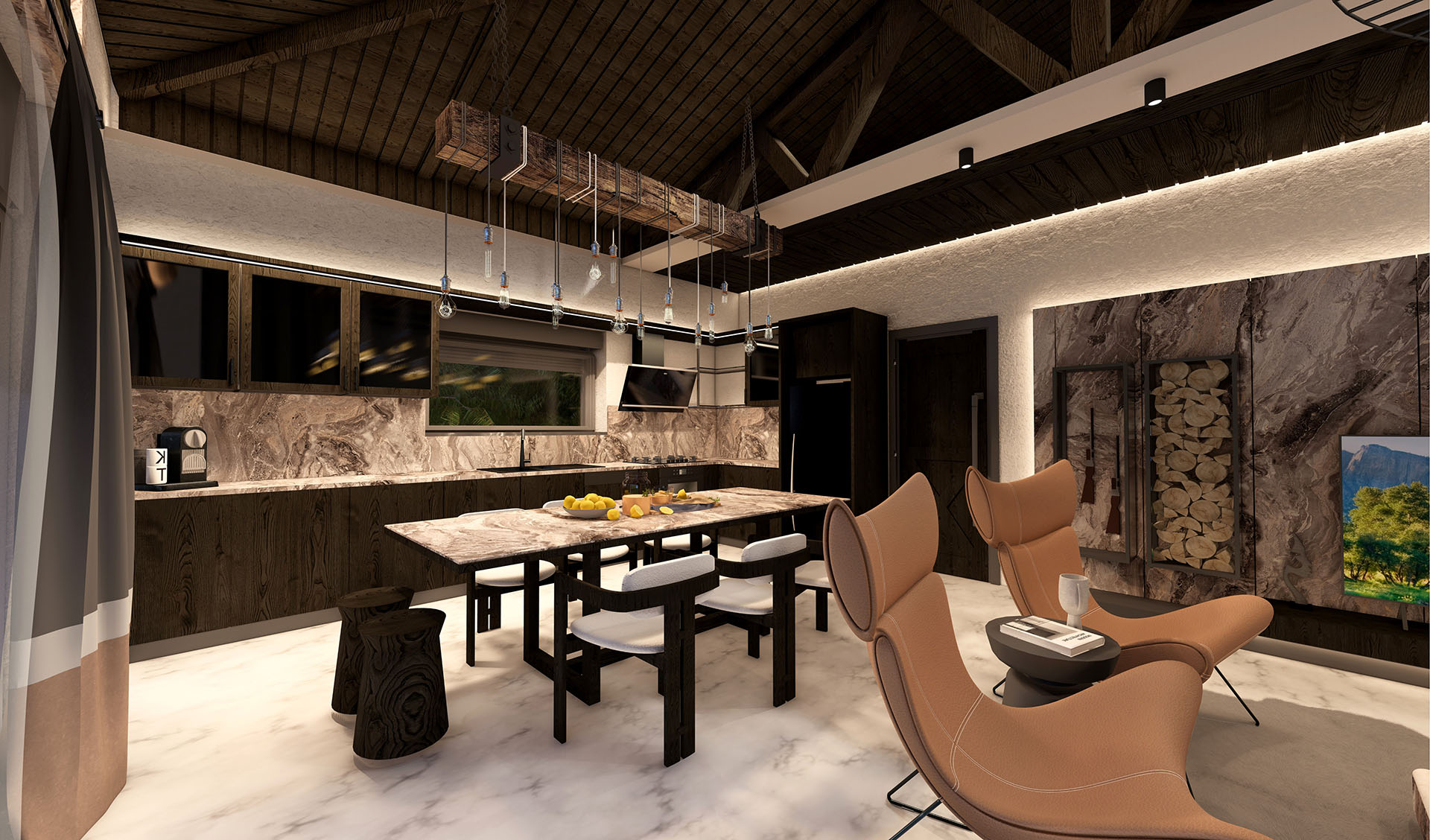 Yüksek tavanlı ahşap kirişler, rustik yüzeylerle harmanlanarak country tarzının samimi atmosferini mekâna taşırken; modern mobilya seçimleri ve güncel malzeme kullanımı, çağdaş bir konfor standardı sağlamaktadır. Panoramik pencerelerden içeri süzülen manzara, mekânın her noktasında hissedilirken; odun depolu şömine detayı, iç mekânın sıcaklığını ve doğal estetiğini pekiştirmektedir.