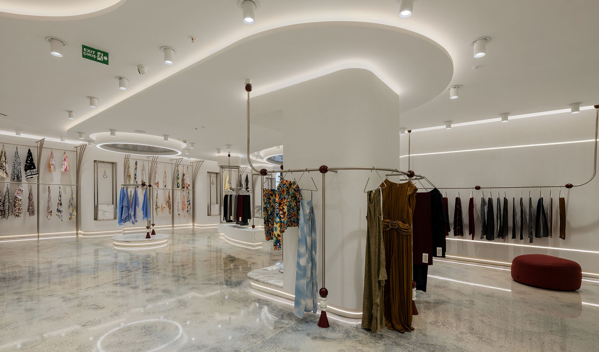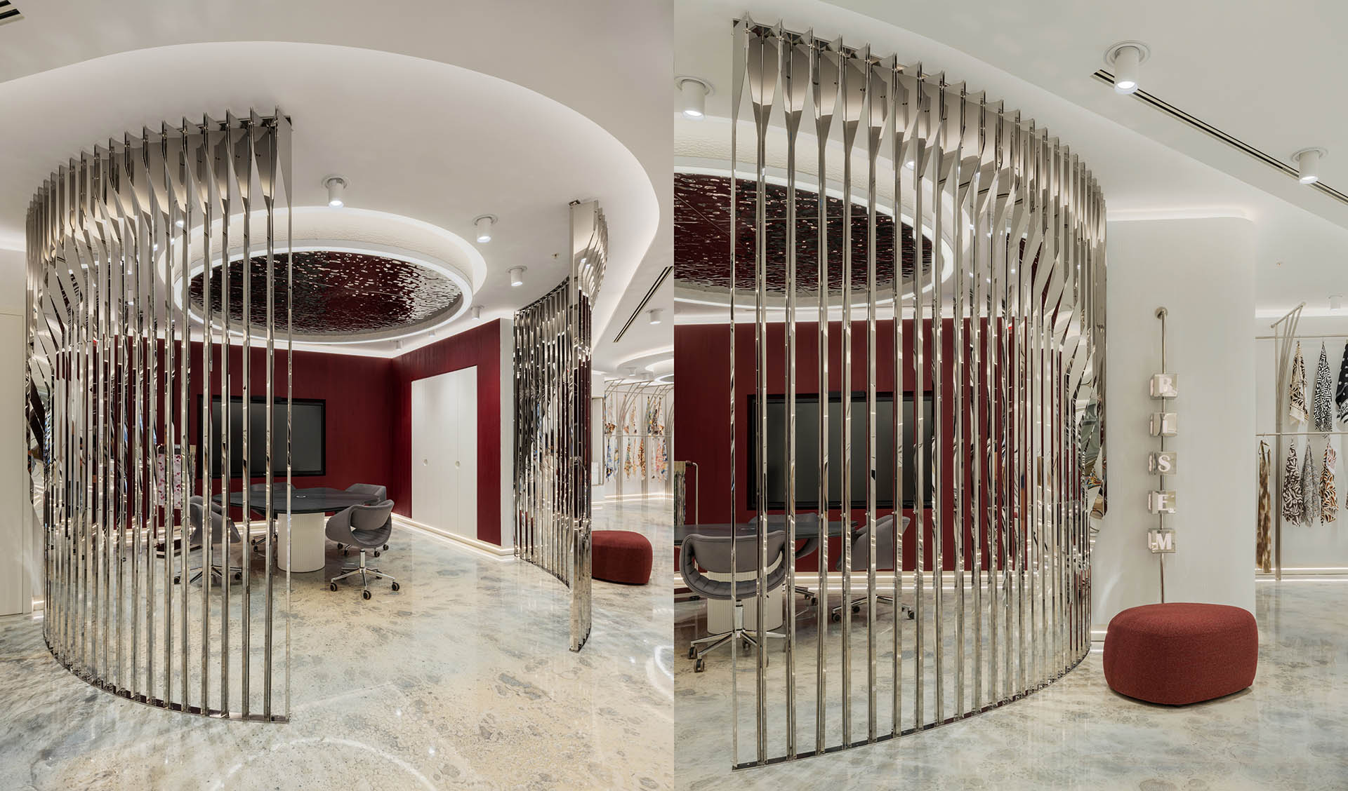 Mekânda ışığın doğal akışını destekleyen yansıtıcı zemin kaplamaları, tavanla kurduğu ritmik ilişki sayesinde mekânsal derinlik kazandırırken; sergileme ünitelerinde kullanılan özelleştirilmiş metal taşıyıcı sistemler, tekstil ürünlerinin başrolde kalmasını sağlayan bir arka plan görevi üstlendi. Merkezde konumlanan eğrisel toplantı alanları ve yarı geçirgen parlak yüzeyler, hem mahremiyet ihtiyacını gözetti hem de showroom içi sirkülasyonu tanımladı.