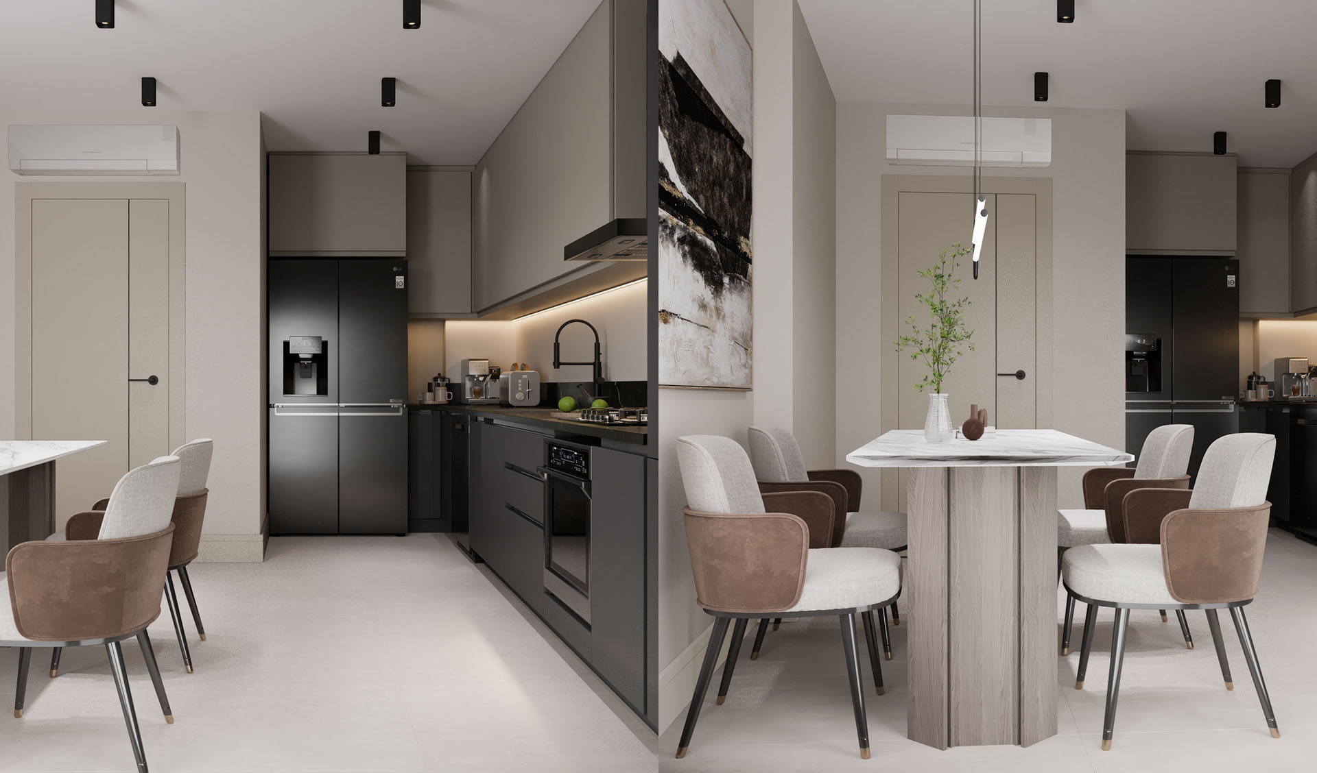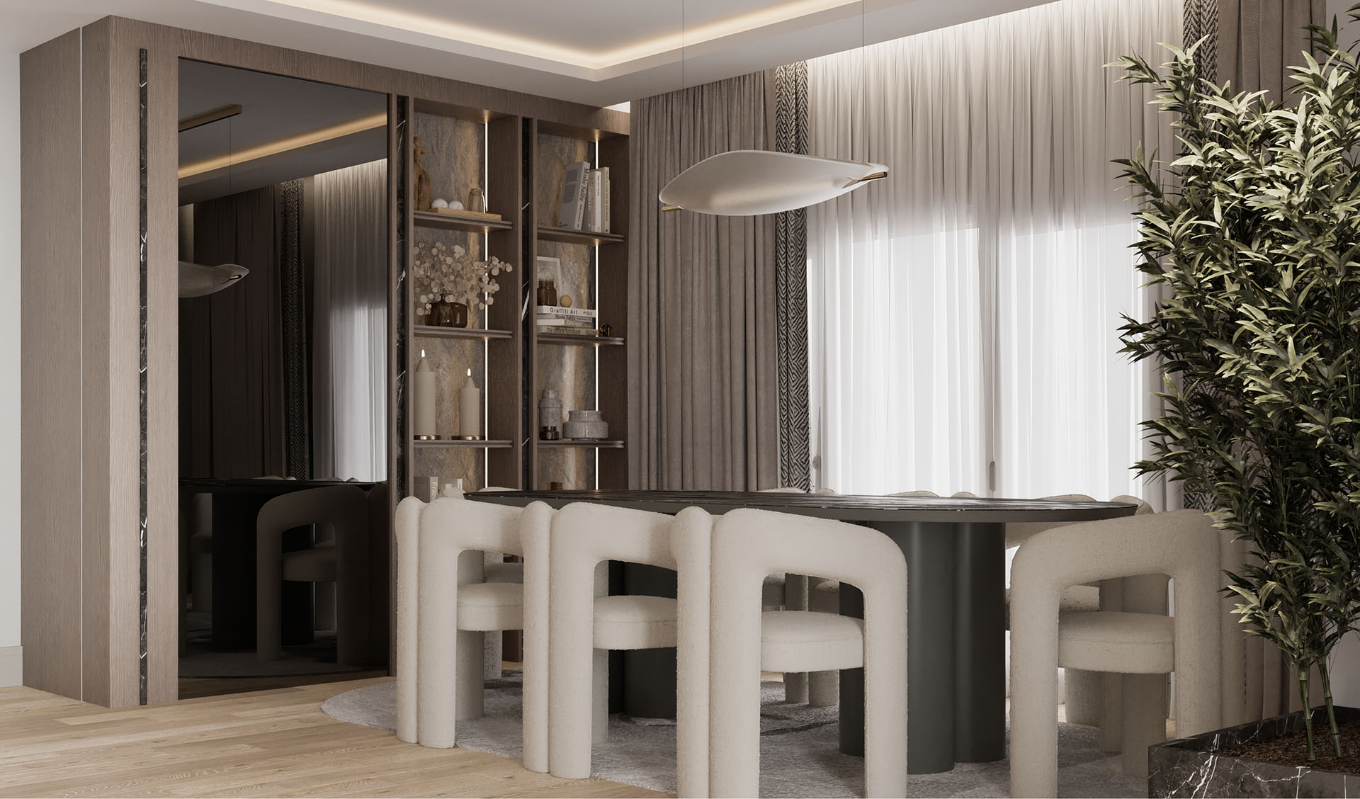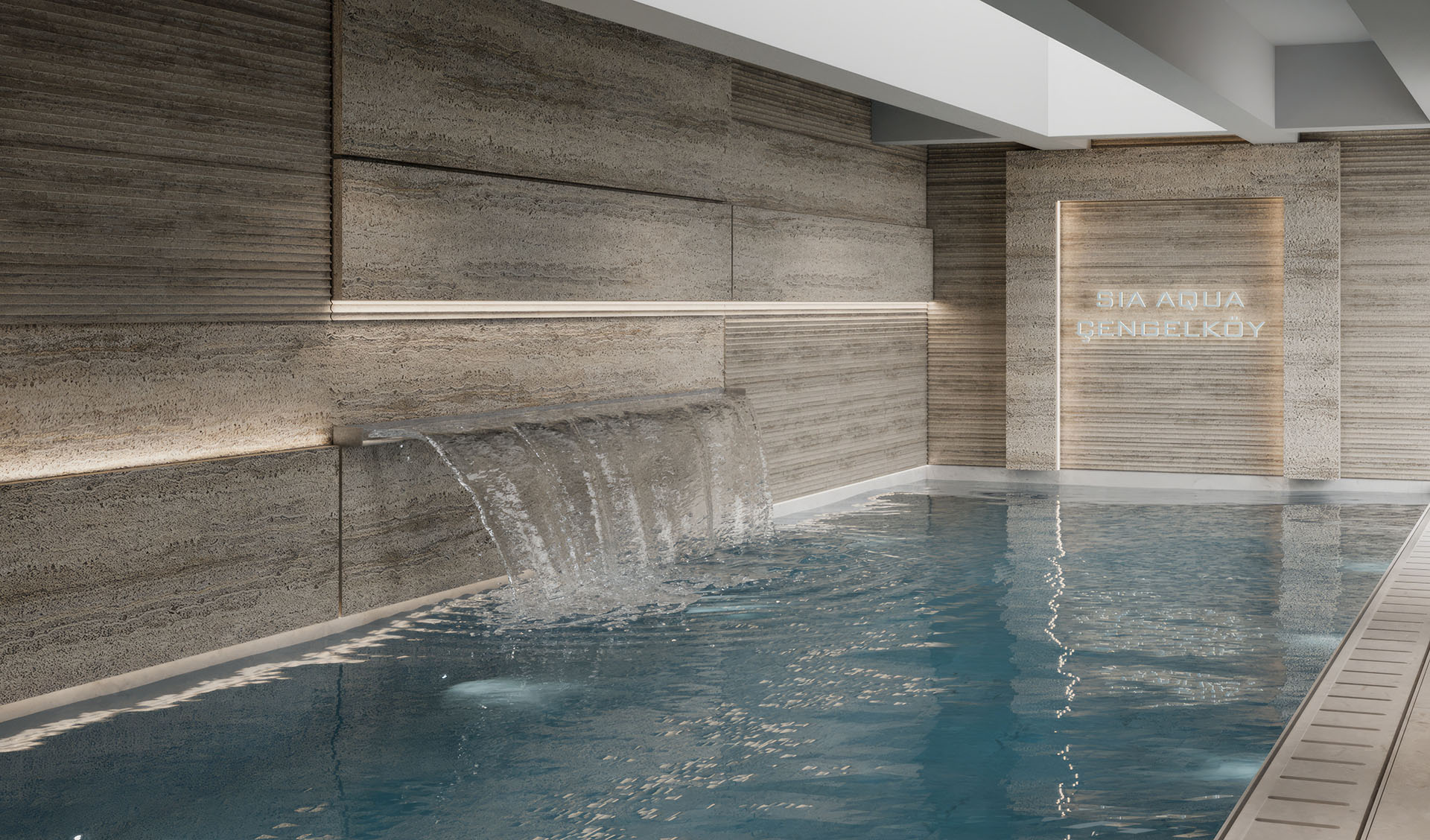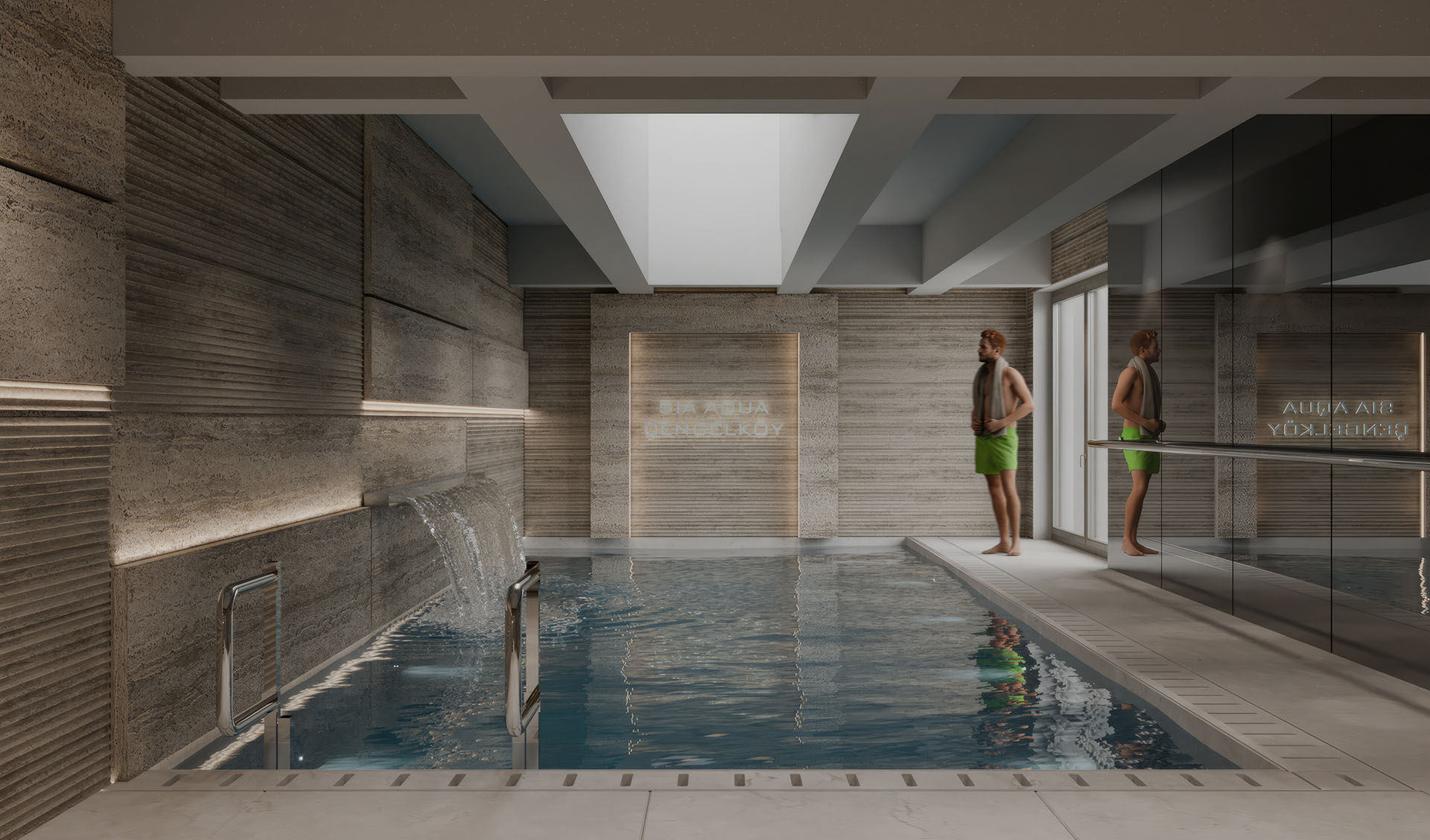 Örnek daire, yalın hatlı mobilyalar, dokulu duvar yüzeyleri ve sıcak tonlu zeminlerle modern bir konfor alanı olarak planlanmıştır. Doğal ışığın hacim içindeki dolaşımını destekleyen geniş cam açıklıklar, ferah ve aydınlık bir atmosfer yaratırken; kontrast renk ve malzeme birlikteliği mekâna dengeli ve davetkâr bir karakter kazandırmıştır. Sosyal alan tasarımlarında, havuz bölümünde dinginlik ve rahatlama hissi, spor salonunda ise enerji ve hareket algısı öncelikli olarak ele alınmıştır. Malzeme seçimleri, konseptin sürdürülebilirlik ve estetik bütünlüğünü destekleyecek şekilde belirlenmiştir.