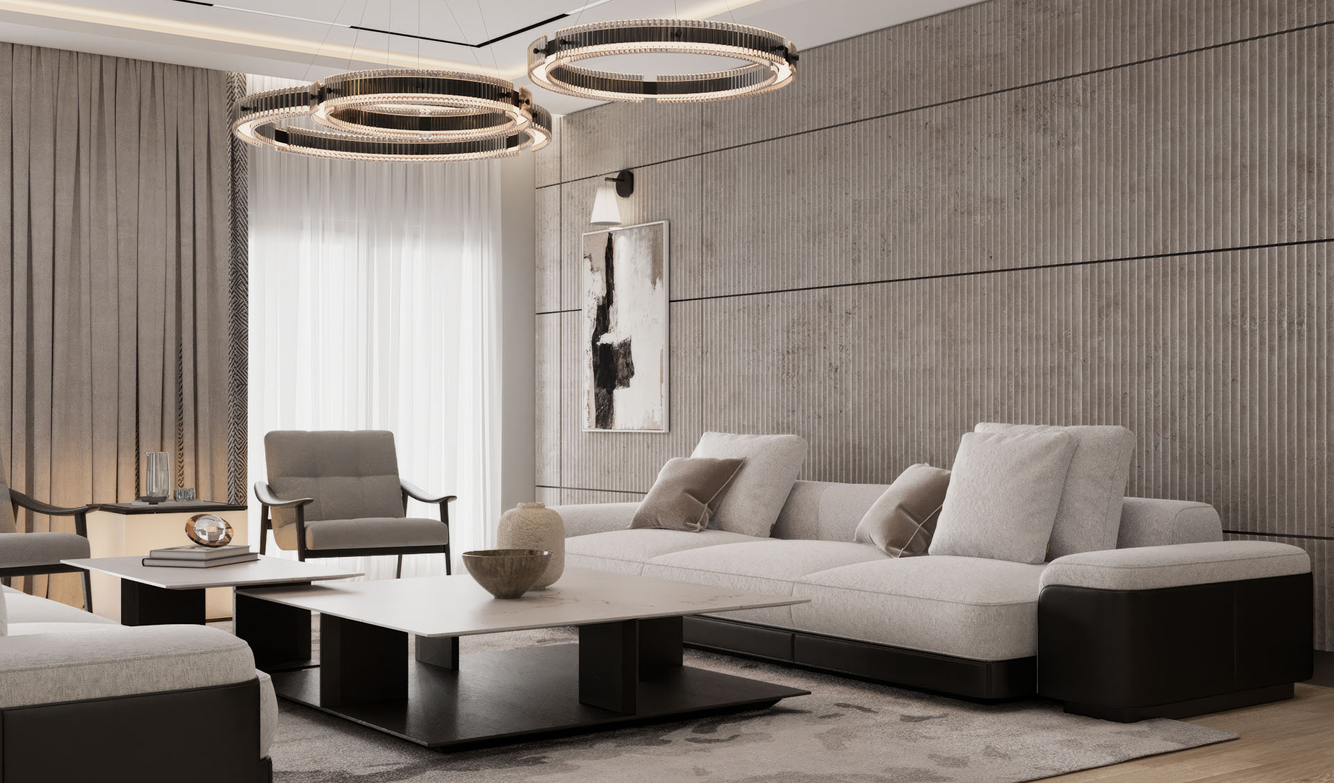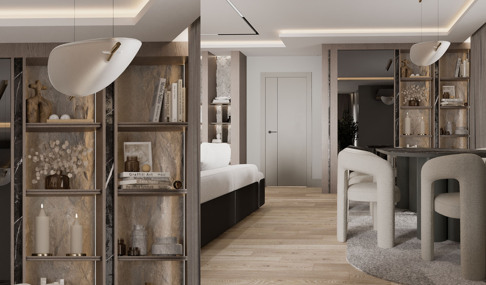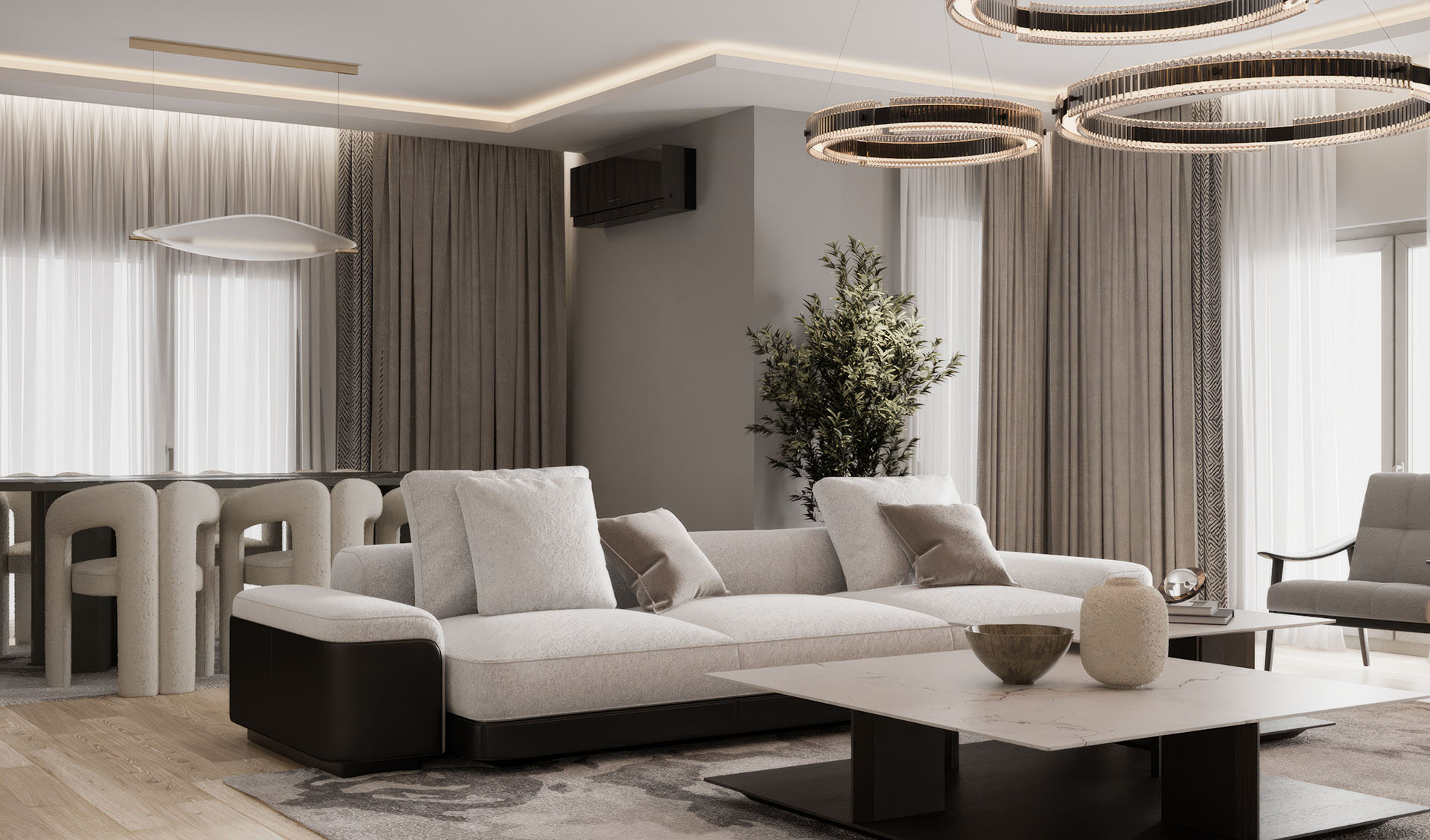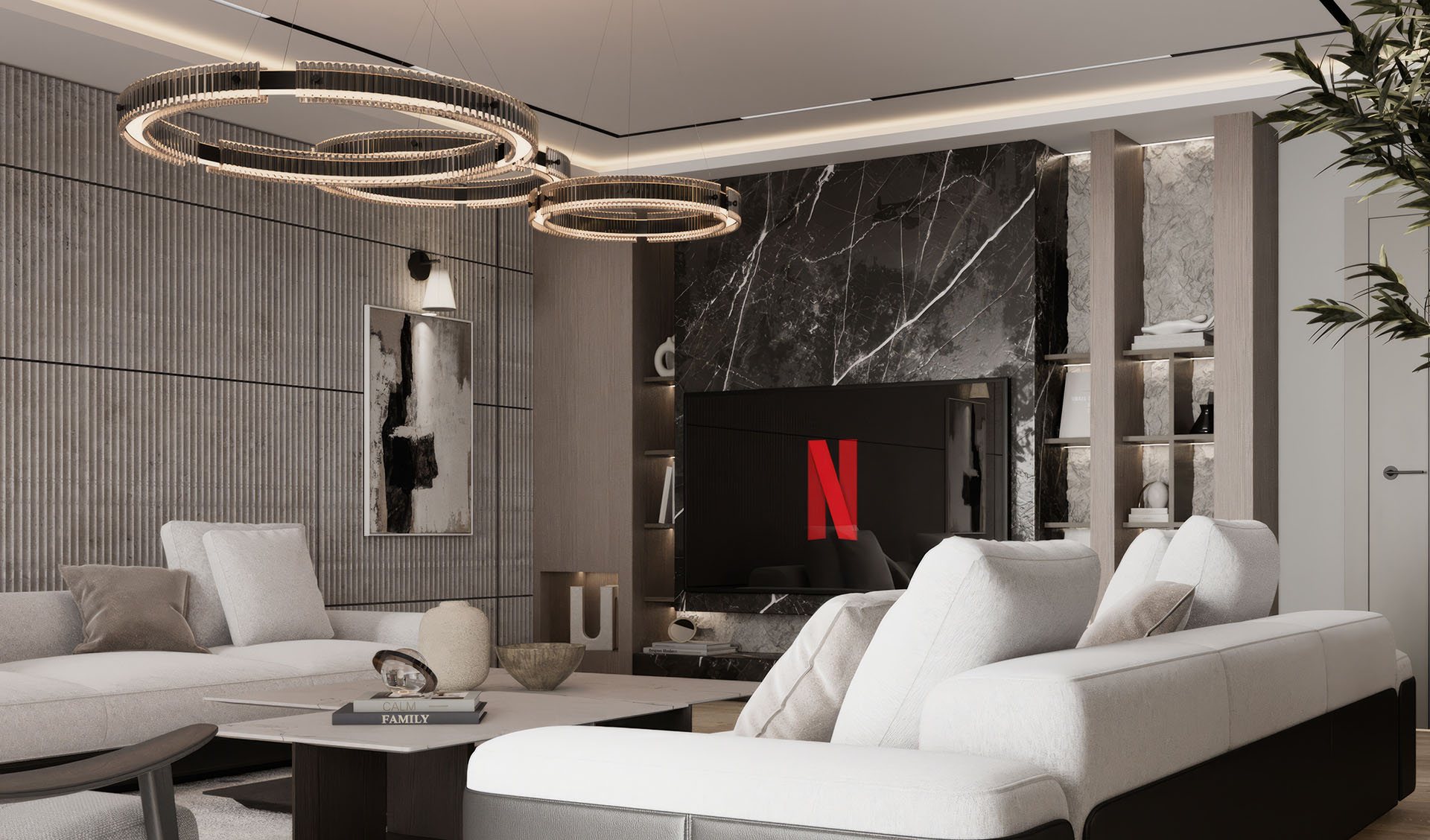 Örnek daire, yalın hatlı mobilyalar, dokulu duvar yüzeyleri ve sıcak tonlu zeminlerle modern bir konfor alanı olarak planlanmıştır. Doğal ışığın hacim içindeki dolaşımını destekleyen geniş cam açıklıklar, ferah ve aydınlık bir atmosfer yaratırken; kontrast renk ve malzeme birlikteliği mekâna dengeli ve davetkâr bir karakter kazandırmıştır. Sosyal alan tasarımlarında, havuz bölümünde dinginlik ve rahatlama hissi, spor salonunda ise enerji ve hareket algısı öncelikli olarak ele alınmıştır. Malzeme seçimleri, konseptin sürdürülebilirlik ve estetik bütünlüğünü destekleyecek şekilde belirlenmiştir.