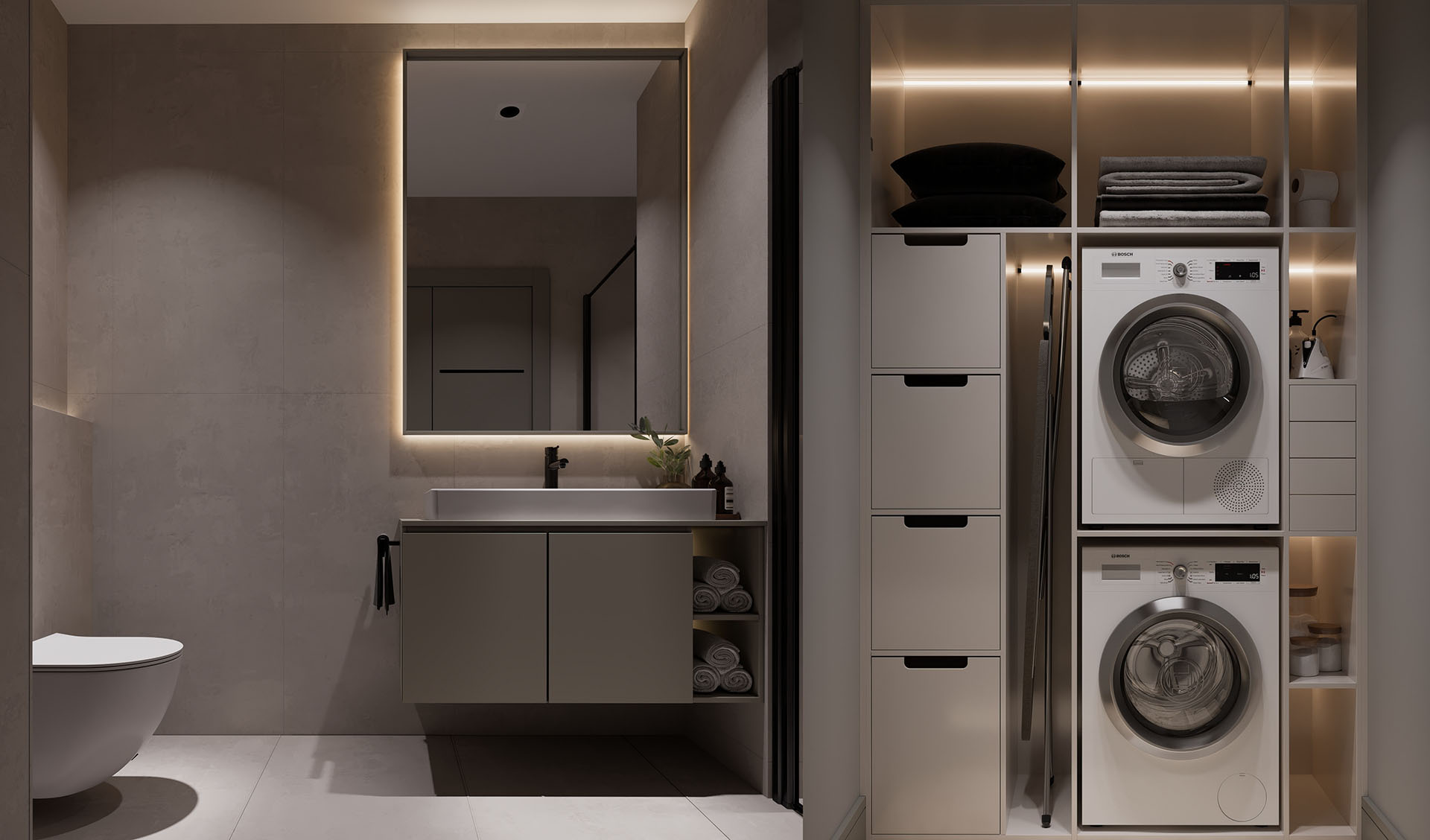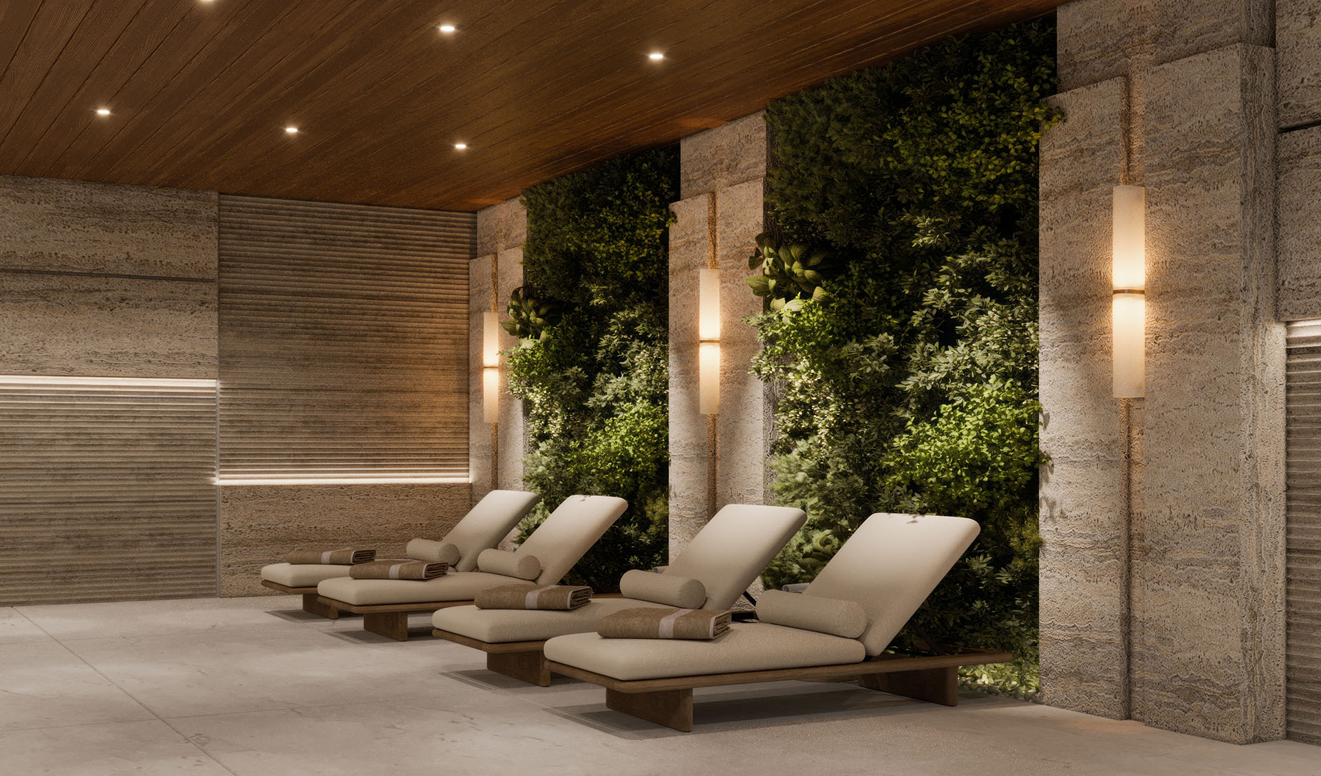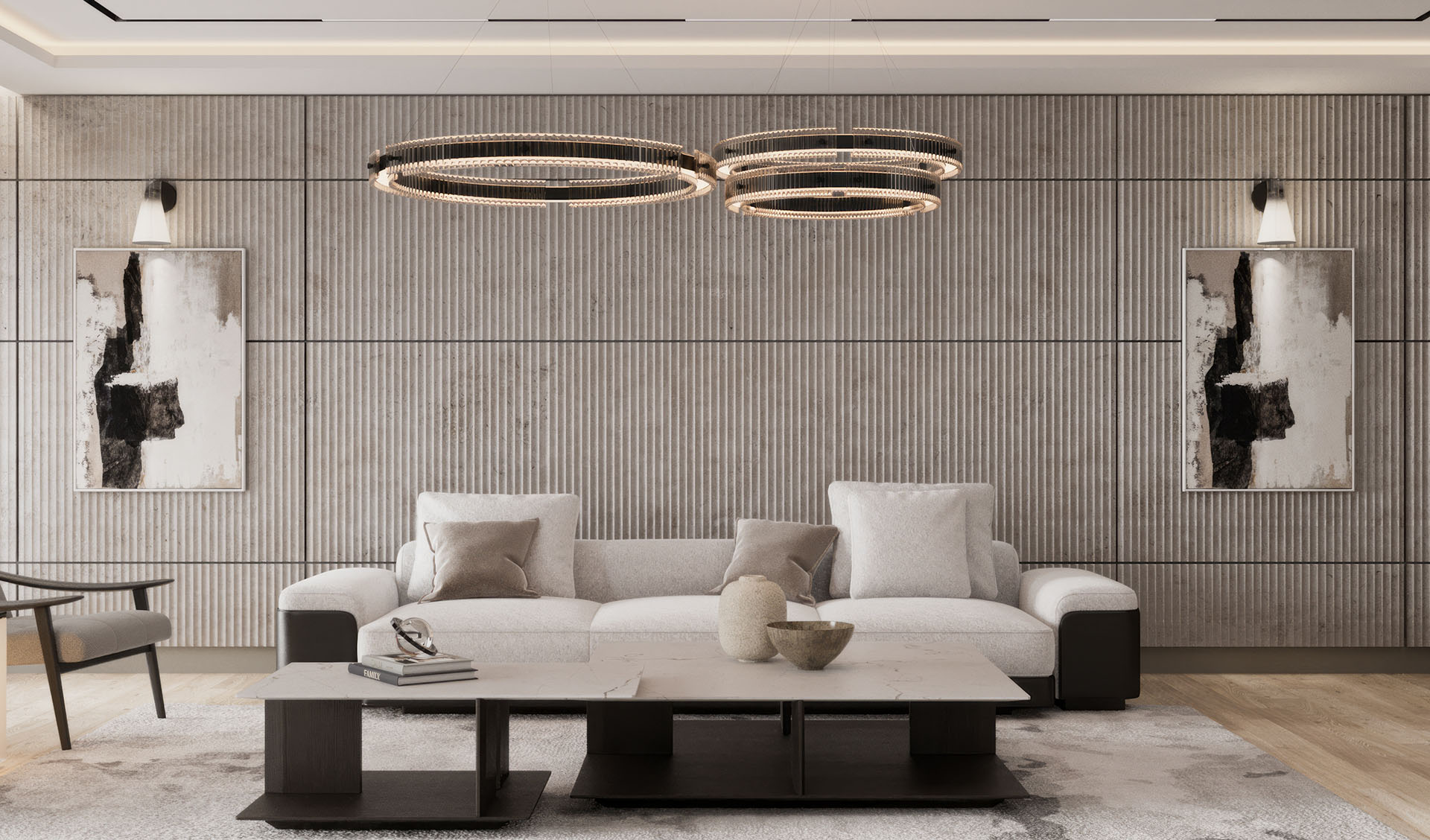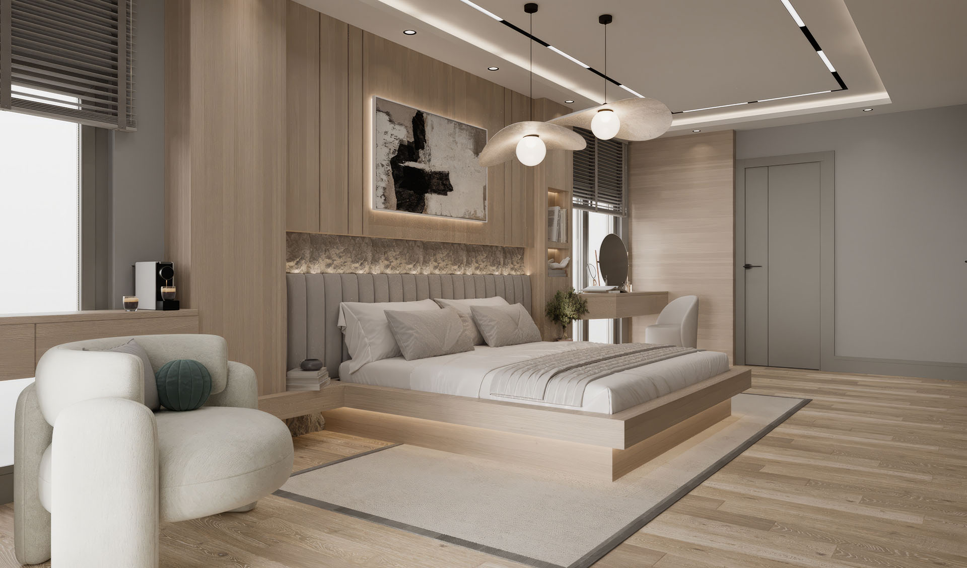 Örnek daire, yalın hatlı mobilyalar, dokulu duvar yüzeyleri ve sıcak tonlu zeminlerle modern bir konfor alanı olarak planlanmıştır. Doğal ışığın hacim içindeki dolaşımını destekleyen geniş cam açıklıklar, ferah ve aydınlık bir atmosfer yaratırken; kontrast renk ve malzeme birlikteliği mekâna dengeli ve davetkâr bir karakter kazandırmıştır. Sosyal alan tasarımlarında, havuz bölümünde dinginlik ve rahatlama hissi, spor salonunda ise enerji ve hareket algısı öncelikli olarak ele alınmıştır. Malzeme seçimleri, konseptin sürdürülebilirlik ve estetik bütünlüğünü destekleyecek şekilde belirlenmiştir.