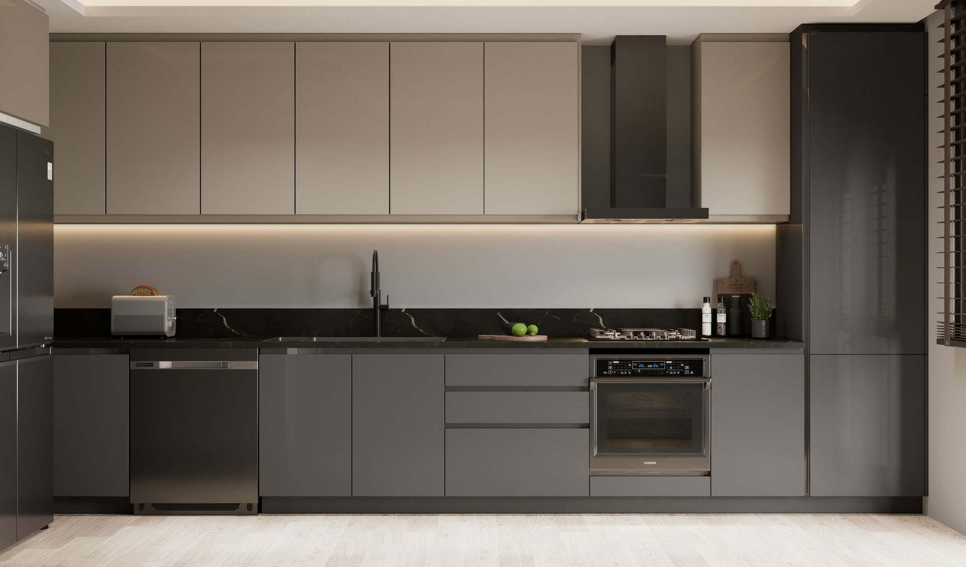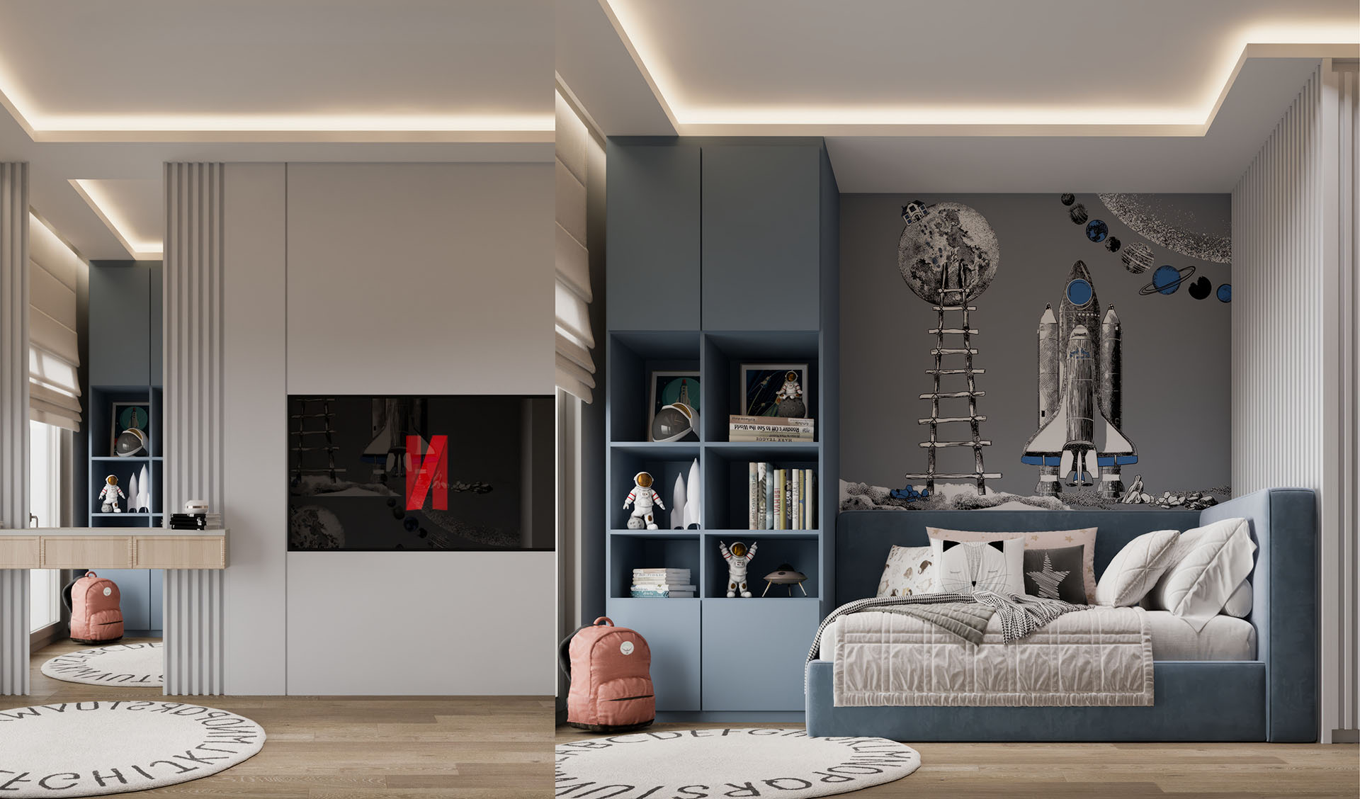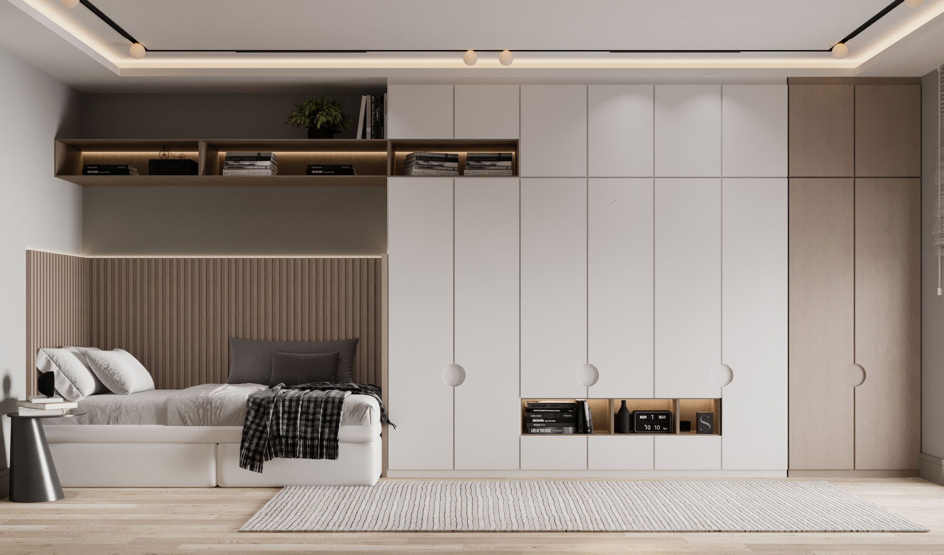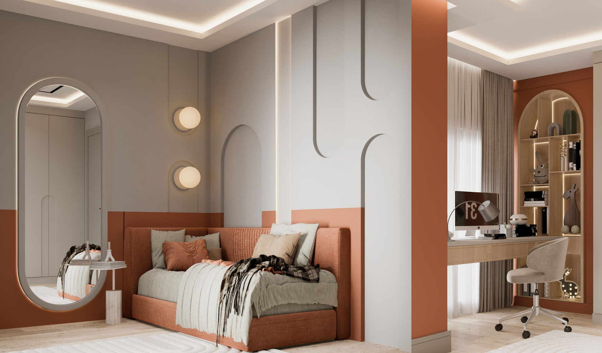 Örnek daire, yalın hatlı mobilyalar, dokulu duvar yüzeyleri ve sıcak tonlu zeminlerle modern bir konfor alanı olarak planlanmıştır. Doğal ışığın hacim içindeki dolaşımını destekleyen geniş cam açıklıklar, ferah ve aydınlık bir atmosfer yaratırken; kontrast renk ve malzeme birlikteliği mekâna dengeli ve davetkâr bir karakter kazandırmıştır. Sosyal alan tasarımlarında, havuz bölümünde dinginlik ve rahatlama hissi, spor salonunda ise enerji ve hareket algısı öncelikli olarak ele alınmıştır. Malzeme seçimleri, konseptin sürdürülebilirlik ve estetik bütünlüğünü destekleyecek şekilde belirlenmiştir.